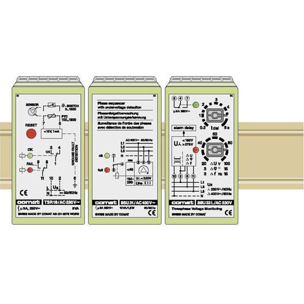 Relè Comat Releco per il controllo della sequenza di fase, protezione termica e controllo trifase con 2 contatti in scambio.